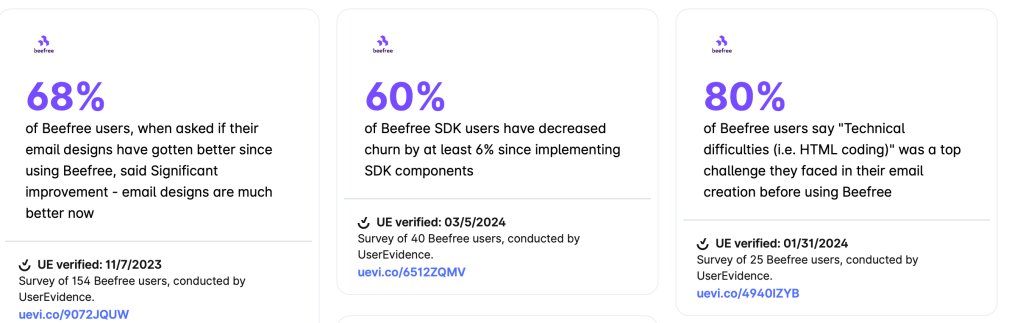 In collaboration with my teammates at Beefree, I created 7 surveys targeting customers for two product lines and a number of segments including agencies and enterprise customers. These surveys yielded statistics and customer testimonials that we used for the website, one-pagers, social media posts, and the website.