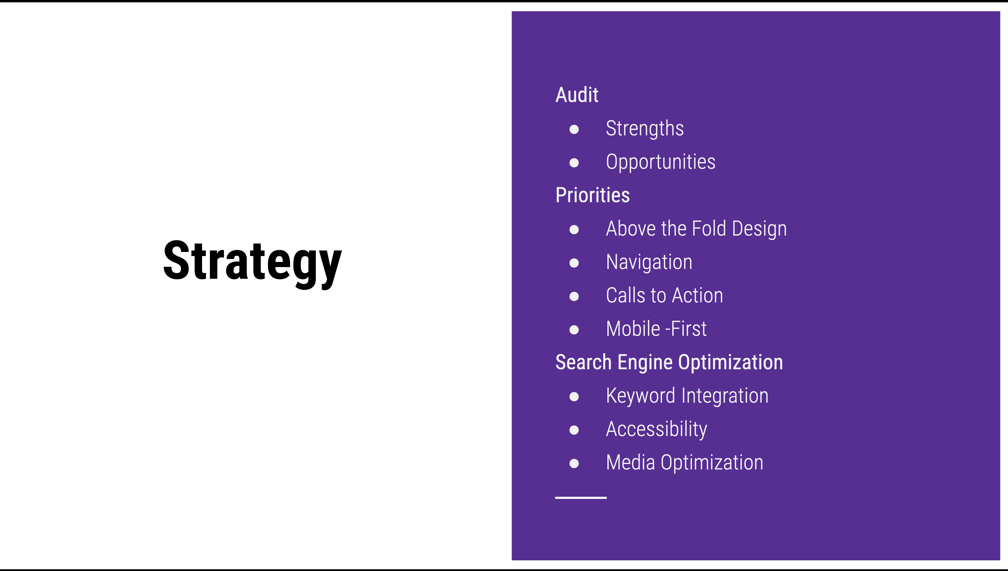 The Process: This client approached me about a full site redesign and we had a detailed conversation about what her aesthetic was and how we could create a mobile-first site that could meet the needs of her customers. I presented a SWOT analysis on the site and we brainstormed how to address the opportunities that she had. I also created a deck to walk her through the changes that were needed and why.
